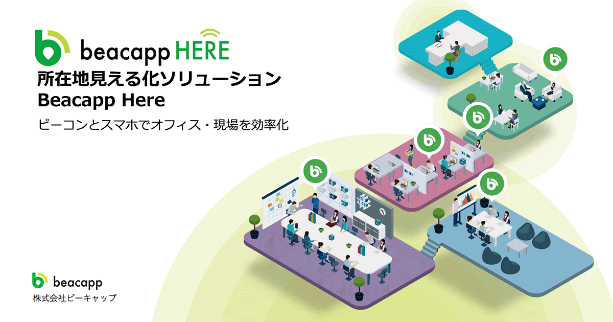 「Beacapp Here」は、ビーコンとスマートフォンを使って、マップ上で所在地を確認できる低コスト・短期間で導入可能なクラウドサービスです。