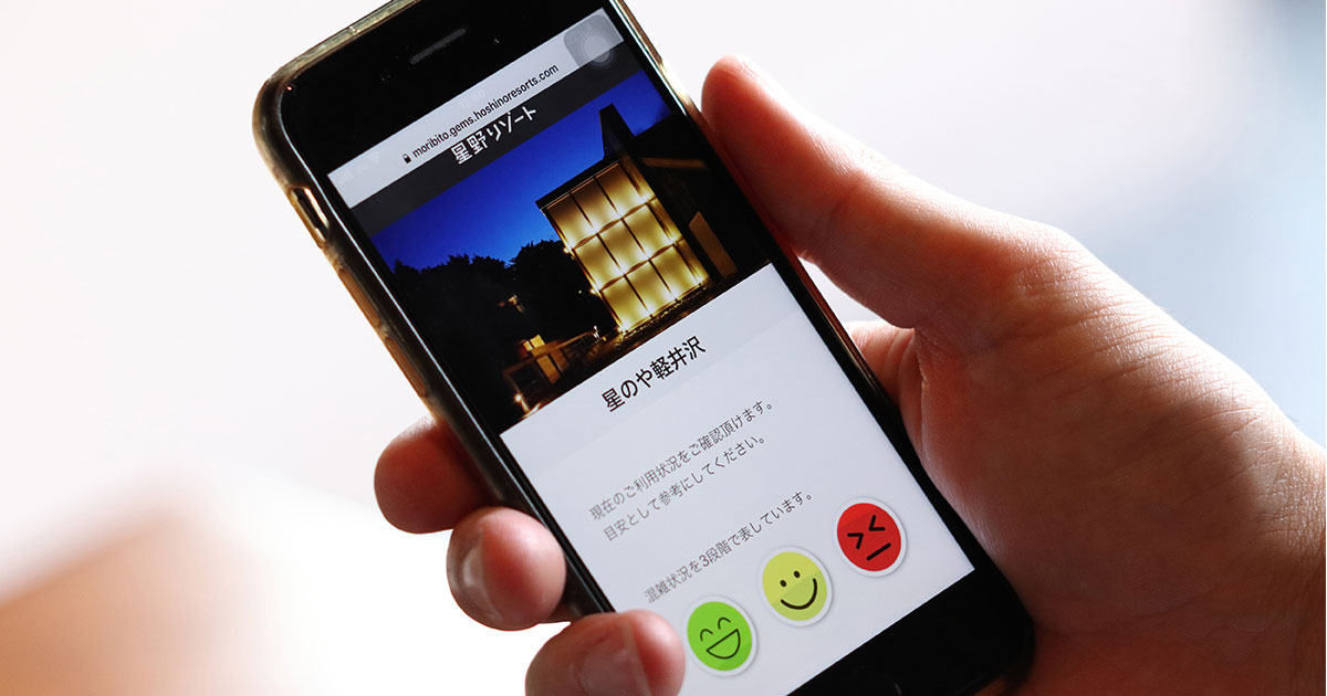 センサーで取得したデータを元に、同じく短期間で星野リゾート様にて独自に開発されたアプリケーションによってスマートフォンからWebブラウザでリアルタイムに混雑状況を確認できます。