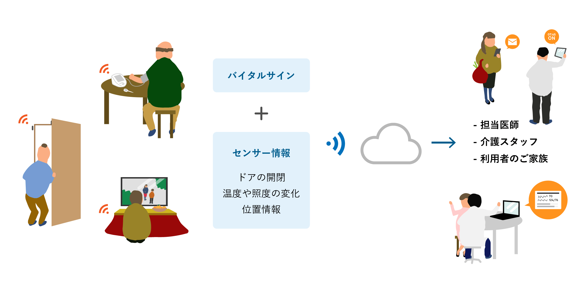 バイタルサインのモニタリング + ホームモニタリングにより、介護スタッフや家族が、サービス利用者の生活状態・健康状態をいつでもどこからでもチェック可能となります。