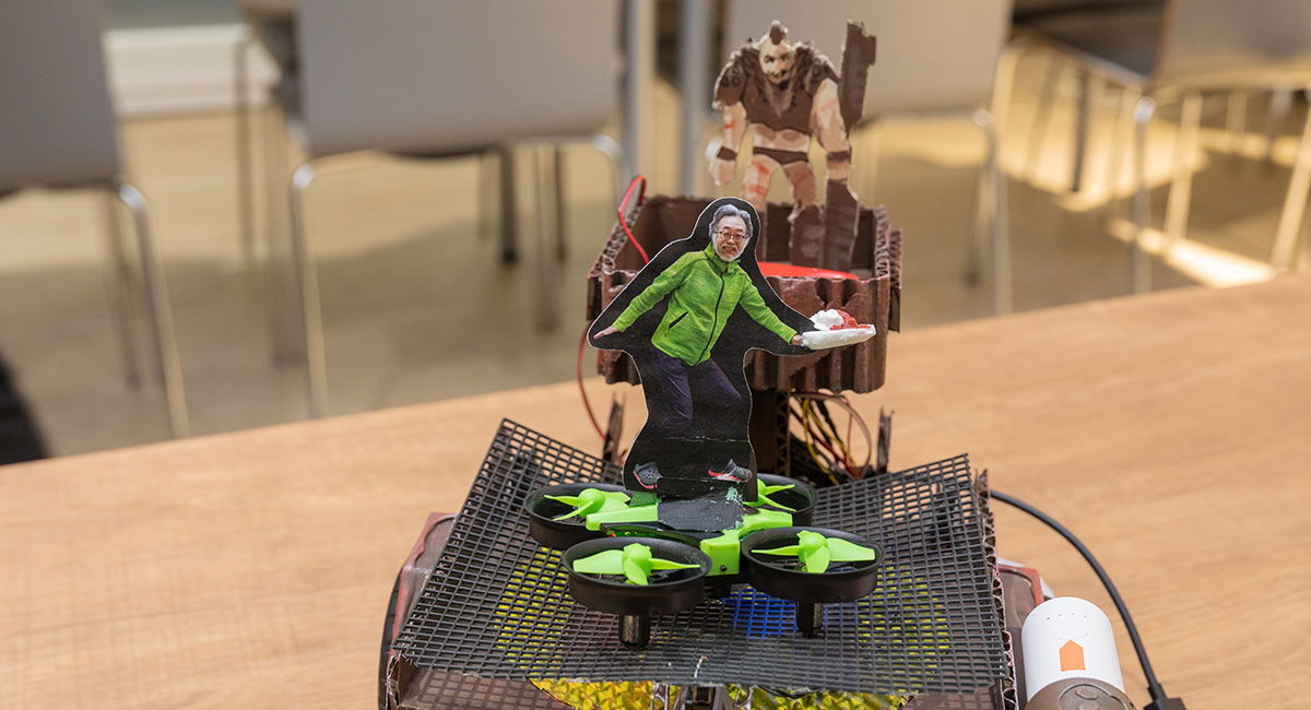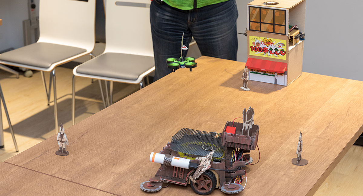 センシングなど技術的な部分も、見て仕組みが想像できるようなアナログな方法で作ってあります。ドローンの着地は重さでスイッチを押していますし、クラッカーが飛んで看板が垂れ下がるのも針金とダンボールです。こうやったらできるのか!こういうことだったら自分にもできるかも!って想像してもらえたら嬉しいなと。