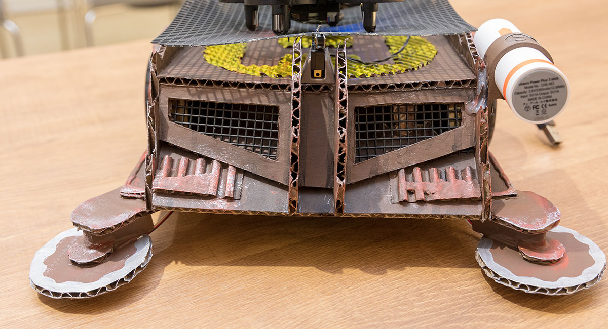 ここで登場するビークルは、obnizのAI Robot Kitがベースとなっています。ダンボール工作で装飾され、炎(に見立てた水蒸気)が噴射する仕組みやドローンの着地を検知するマイクロスイッチが仕込まれています。