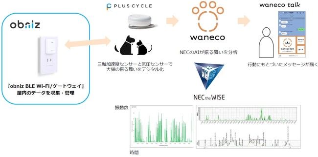首輪に付いた犬猫用活動量計『PLUS CYCLE』(プラスサイクル/製造元:株式会社 日本動物高度医療センター)から取得した各種データを、『obniz BLE/Wi-Fiゲートウェイ』で収集・管理し、飼い主の皆さまがLINEを通じて遠隔から愛犬・愛猫の様子を確認できるほか、蓄積されたデータおよびNECの最先端AI技術群 『NEC the WISE』で分析した結果は動物病院などの事業者と連携され、健康管理や飼育支援に活用されていきます。