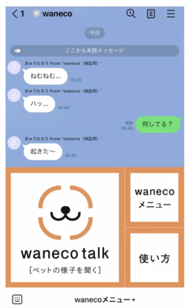 愛玩動物コミュニケーションプラットフォームサービス『waneco』ならではの機能のひとつが、飼い主が離れたところからも愛犬や愛猫の様子をLINE上で会話のように確認できる『waneco talk』です。