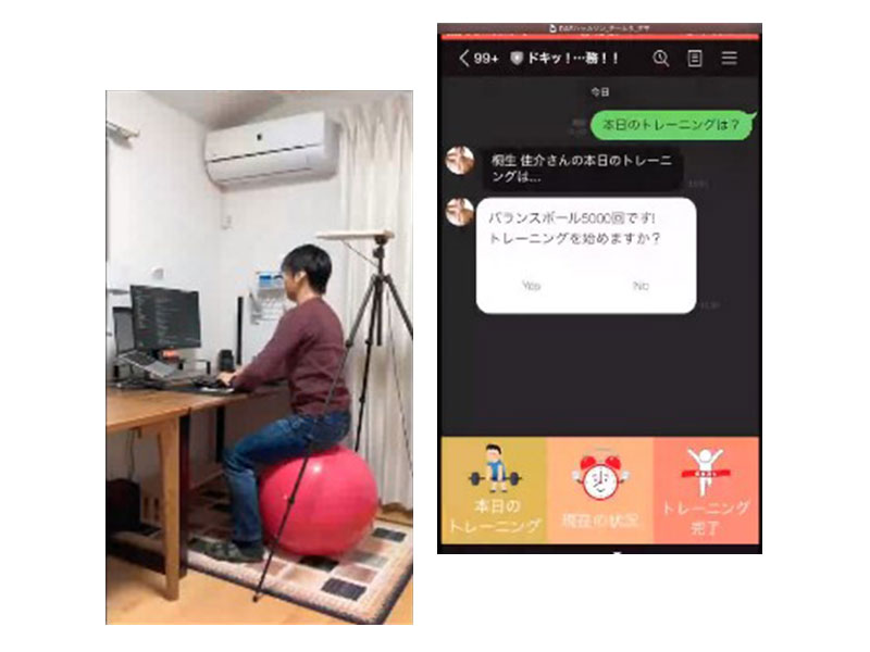 「特にヒューマンインタフェースに力を入れました。日頃から使っている仕組みの方が日常に溶け込むだろうと考え、デジタルとしてのインタフェースはLINEを使いました。企業の公式BOTを参考にしながら、我々のアイデアを具現化するためのUIを設計しました。アナログとしてのインタフェースには『obniz』を使いました。どうすればトレーニングの回数を計測できるだろうか?と考えつつ、試しにセンサを動作させてみたり、計測の閾値を調整してみたりと事前準備はじっくりとやりました」