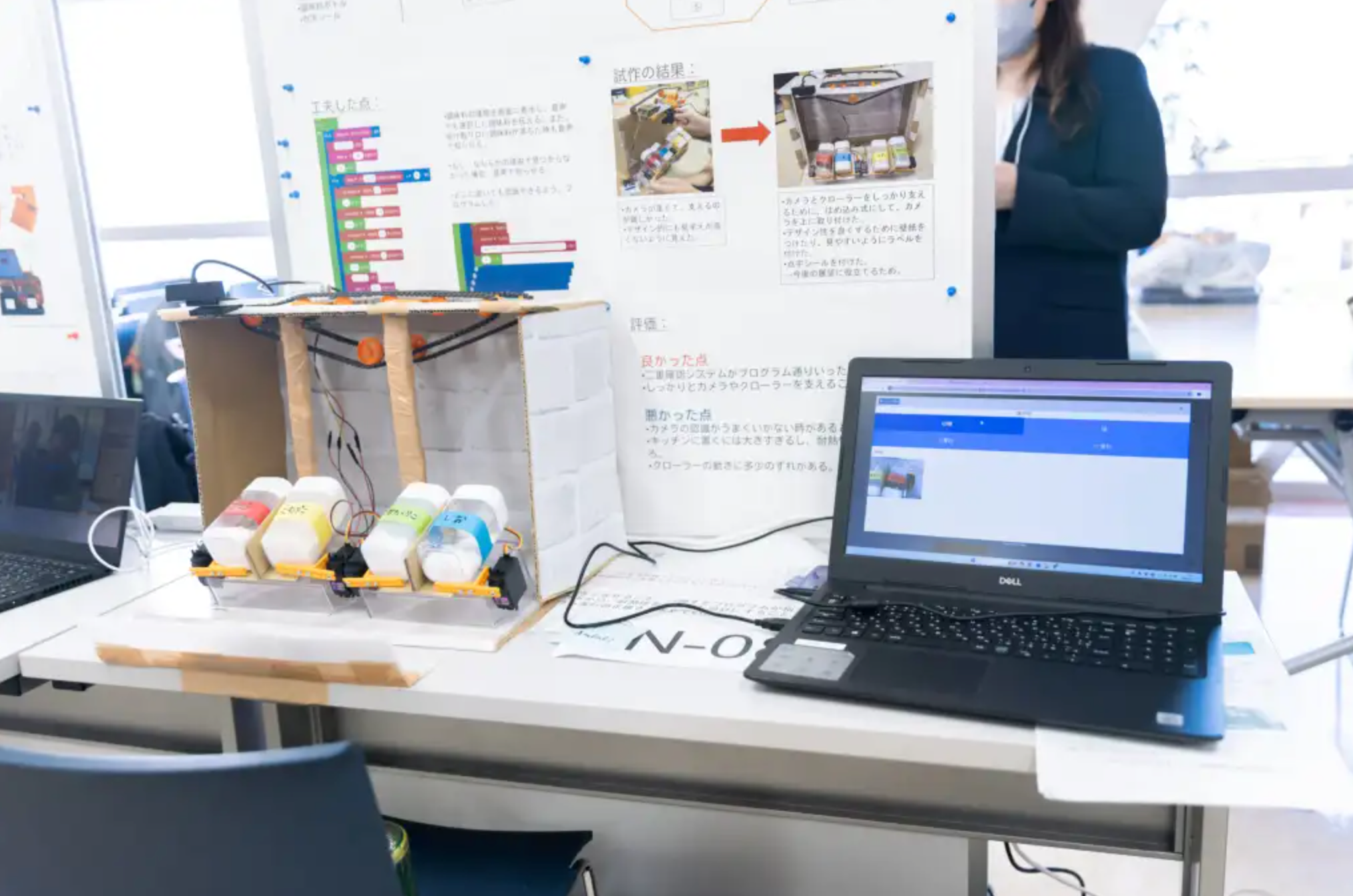 ロボットAIテクノロジー専攻マスターコースでは、IoTのマイコンボードであるobnizを活用し(obniz社とのカリキュラム開発リリース)、ロボット開発を行いました。また、Teacharable Machineを連携させることで、画像認識AIを導入し、画像認識をした上でロボットを動かして、分別を行う装置開発に挑戦しました。まさに、工場ラインなどで今導入されている方法を小中学生が自身の自由な興味を発想で開発をしました。