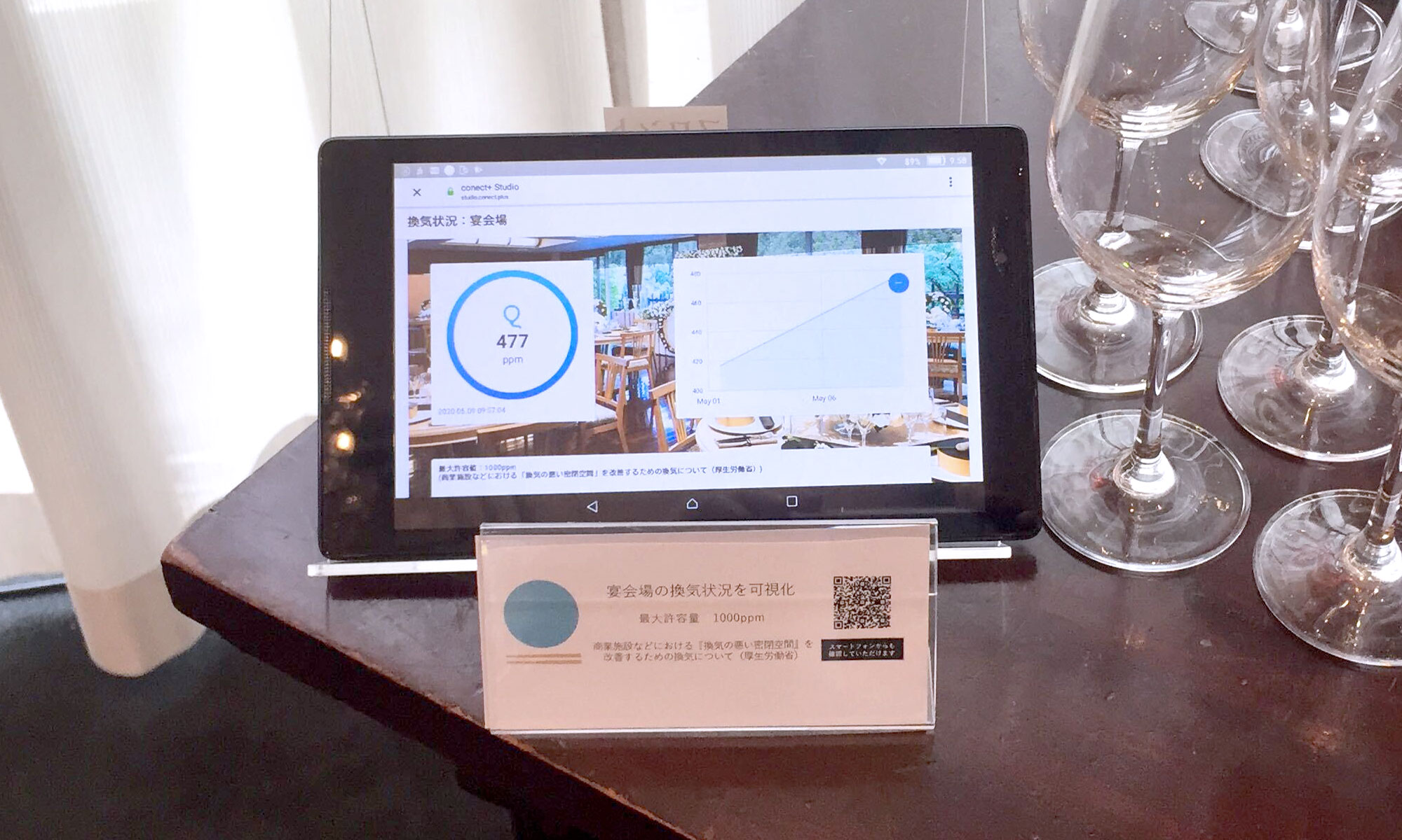 センサーで取得したCO2濃度の数値は、同会場側だけが知るのではなく、会場内のタブレットやサイネージへの表示、二次元バーコードを利用し誰でもスマートフォンなどで換気状況を閲覧できる環境を整え、新郎新婦や来場者も「安心・安全」を実感できる仕組みを提供しています。