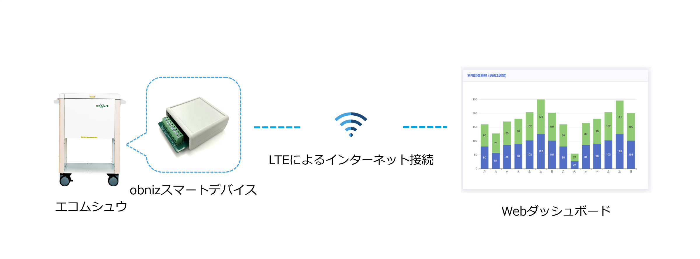 そこで今回、obnizの機器IoT化ソリューション「obniz Now」を導入し、遠隔監視システムを構築しました。エコムシュウにobnizのスマートデバイスを後付けし、スマートデバイス内蔵のLTEでインターネット接続。本システムにより、Webダッシュボードから、エコムシュウの利用状況やエラーを機器単位・全社単位で一元管理できるようになりました。