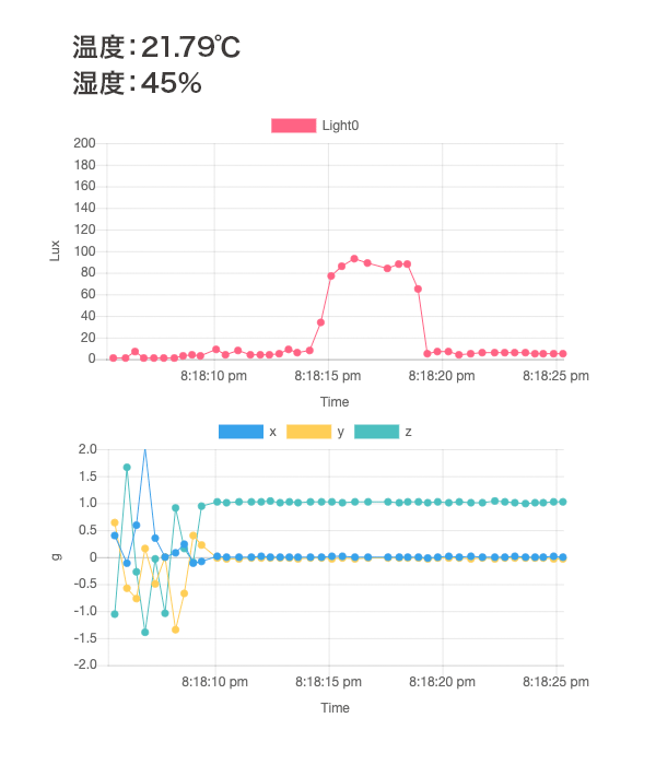 HTML/JavaScriptを使って、センサーで取得した値の表示やグラフ化、UIの作成などもブラウザ上で簡単に実装できます。特別な開発環境は必要ありません。