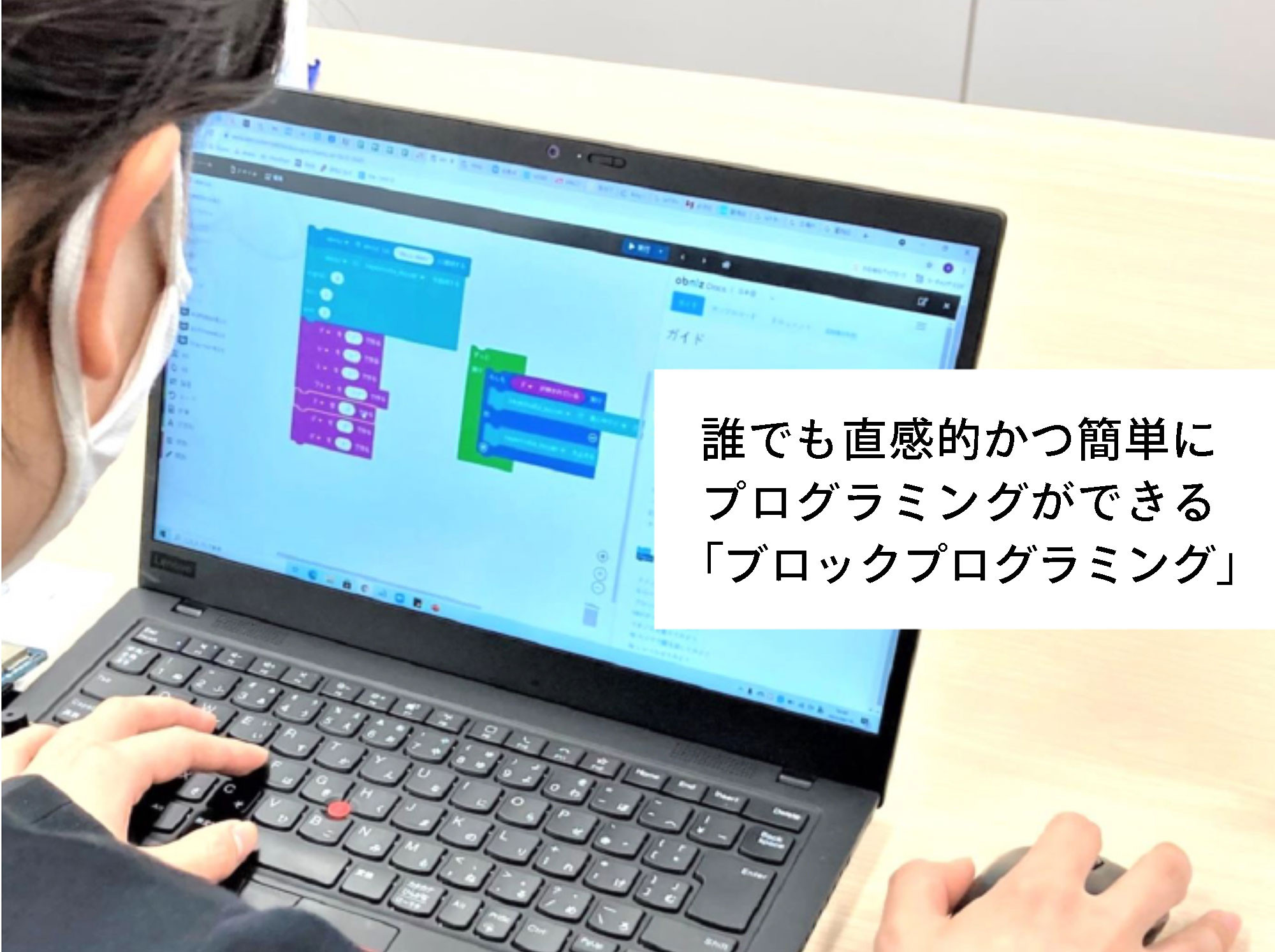 当日は、株式会社obnizのスタッフが講師となり、直感的かつ簡単に扱えるビジュアル系プログラミング言語「ブロックプログラム」を用いてワークショップを進行します。