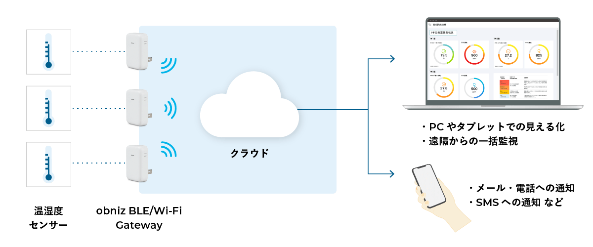 また、設定したしきい値を超えた際には、警報音を鳴らす、メールやSMS、電話等に通知する機能を備えることも可能で、関係者への行動を促すことができます。