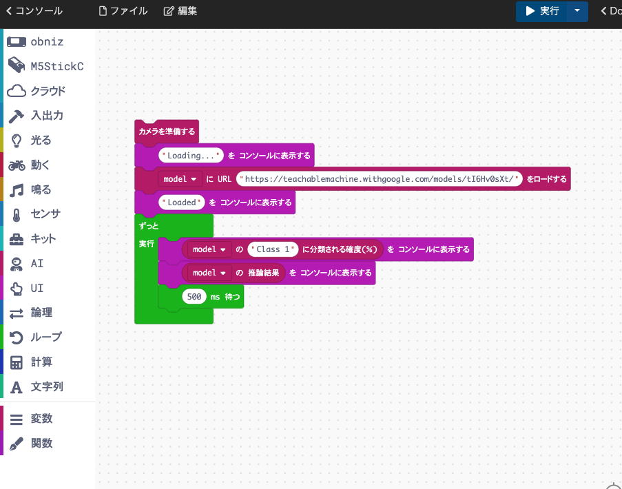 次に、用意できたモデルをURLでブロックプログラムから参照し、カメラを使うだけ。気軽に学習させたモデルから写っているものを分類することができるようになります。