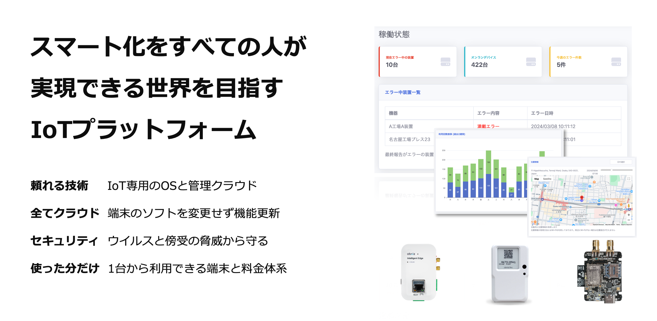 これらのハードウェア群は、当社が開発・提供するクラウドシステム「obniz Now」と連携し、複数拠点に点在する装置の状態監視や異常検知、遠隔操作、エラー要因の把握といった機能を統合的に提供します。自社製品の遠隔管理、建物管理、工場設備、屋外インフラなど、場所や用途を問わず、機器の見える化とスマートサービスの開発を可能にするインフラとして、多くの導入が進んでいます。