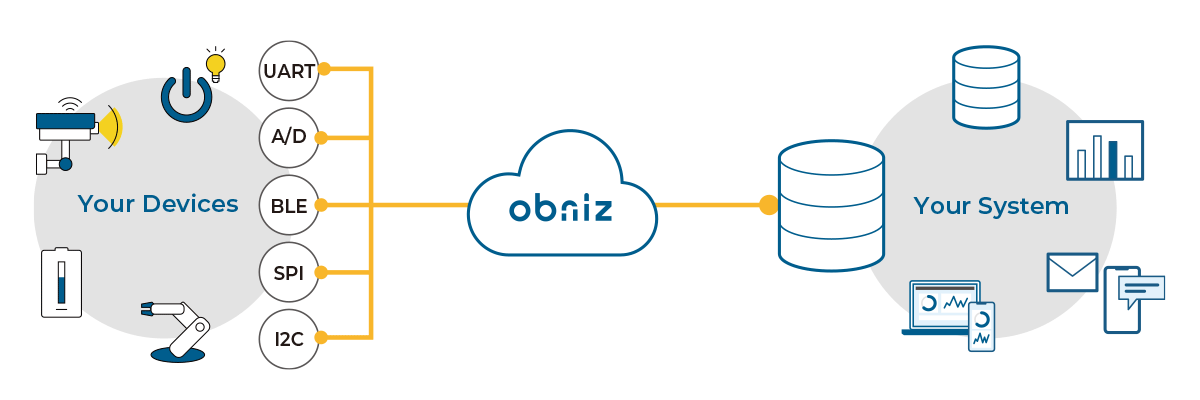 『obniz』の技術は、電子回路で使える、つまりマイコンで動くOS(obnizOS)と、専用のクラウドを提供しています。このOSを搭載したデバイスは、SPI(Serial Peripheral Interface)やUART(Universal Asynchronous Receiver/Transmitter)などの電気的な通信による接続や、BLE(Bluetooth Low Energy)などの無線通信でさまざまな機器に接続することができます。これを「オールインプラットフォーム」とも呼んでいます。
