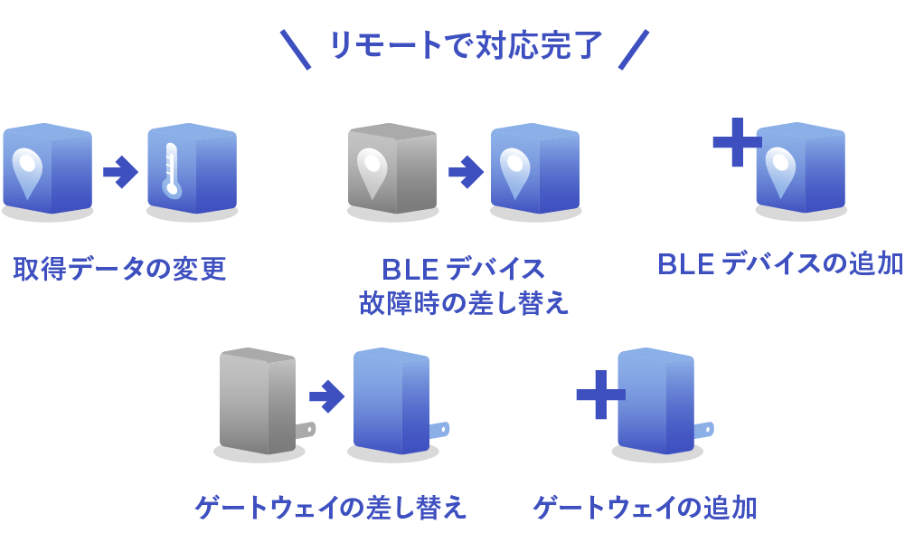 たとえば、「これまで使っていた温度センサーが廃盤になってしまったから、他の機種に変更する必要がある」「ドアの開閉センサーを外したい」といった場合も、ゲートウェイに変更は加えず、現地に必要な別のセンサーを送るだけで対応できます。そして、センサーの設置方法の指示さえすれば、あとはクラウド上で全ての更新作業が行えます。